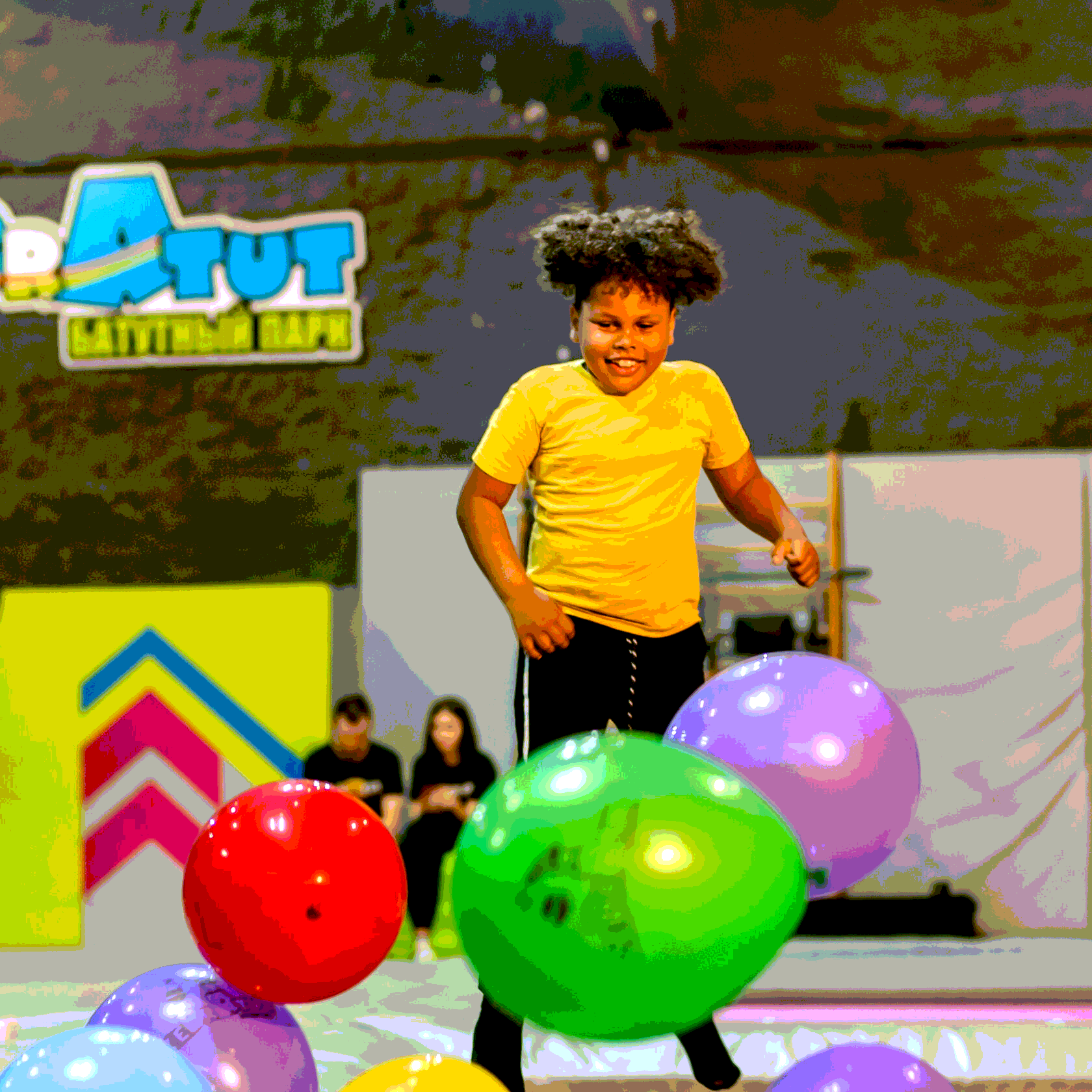 Дети испытывают батуты на прыгучесть, принимают участие в активностях.